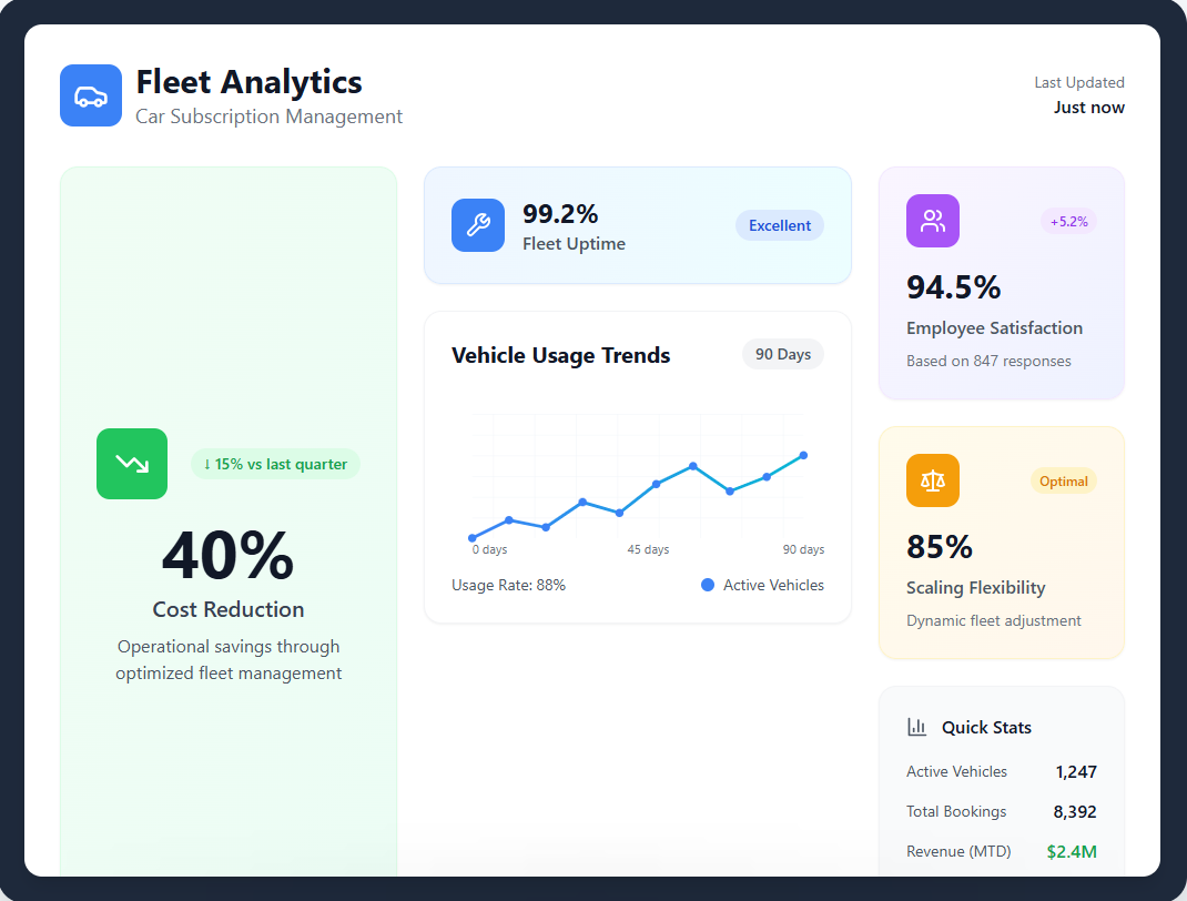 ABC Home Services transformed their operations by replacing their aging fleet of 15 maintenance vans with our flexible car subscription service. Within 90 days, they saw immediate improvements in reliability, cost predictability, and team productivity.